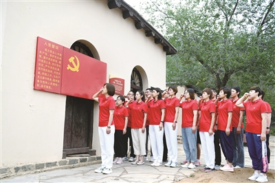 6月28日,河北省石家庄市人民医院的12名新党员来到革命圣地西柏坡,开展主题党日活动。他们都是参加援鄂抗疫的医务人员,分别在武汉市第七医院、金银潭医院等工作,因表现突出,今年三月份在武汉火线入党。这些新党员一致表示,在今后的工作中要不忘初心,牢记使命,继续发扬抗疫精神,争做优秀党员。图为在西柏坡七届二中全会旧址,12名援鄂抗疫新党员与老党员一起重温入党誓词。新华社发(陈其保 摄)