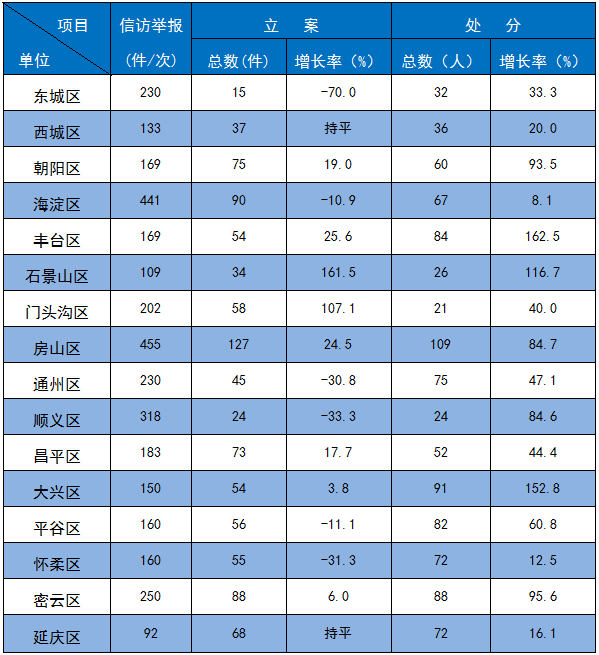 2017年1至6月,北京市纪检监察机关共接受信访举报8057件(次),处置问题线索4893件,谈话函询1499件(次),立案1254件,下降3.4%,处分1321人,增长36.5%。处分厅局级干部26人,县处级干部203人,乡科级干部232人,移送司法20人。查处违反中央八项规定精神和市委实施意见202人,“小官贪腐”194人。