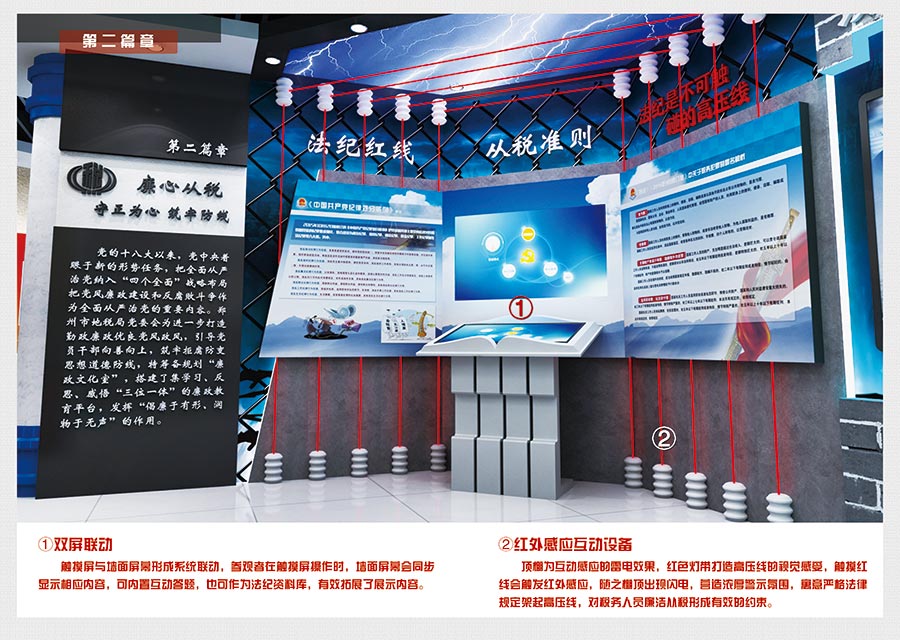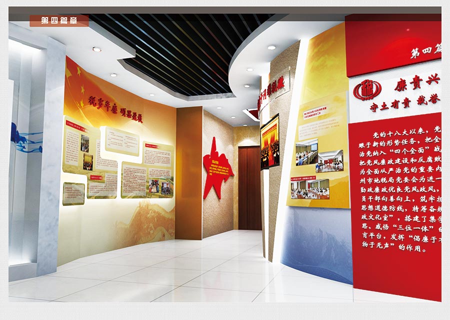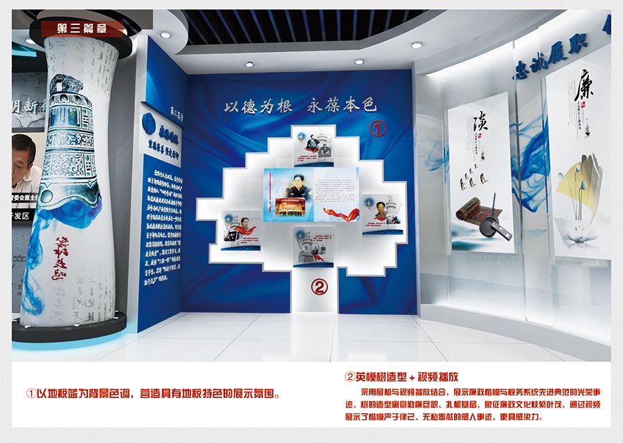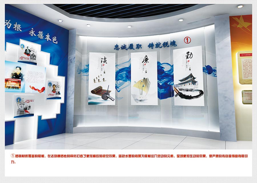所展示的内容立足手税务工作实院,注重廉政教育的针劝性和实效性,包含了党员工部的作风修养、税务人员的从业要求、廉政文化的建设成果等。后期效果在设计上会配合文字方案,因地制自体现地方猜色,版面背景设计选用当地特色元素,达到廉政文化主题与当地区域发展特色相融合的效果。