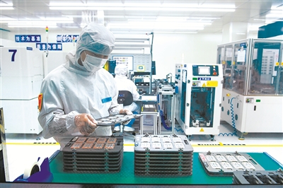 图为在东风公司旗下智新半导体股份有限公司车规级绝缘栅双极型晶体管(IGBT)模块自动化生产车间,工作人员对产品进行质量检验。蔡骏 摄