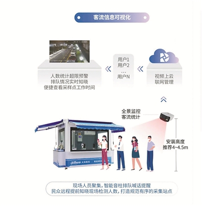 为方便居民错峰检测,提前知晓站点情况,由浙江大华技术股份有限公司设计的“核酸采集工作站”推出客流信息可视化服务,通过安装全景全彩摄像机,进行客流实时统计,并将视频和数据上传至云端,用户完成注册后便可远程查看现场情况。