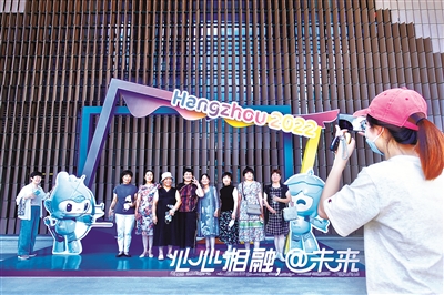 图为市民参观富阳银湖体育中心并合影留念,该中心为杭州亚运会射击、射箭、现代五项比赛场地。 中新社记者 钱晨菲 摄
