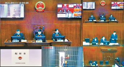 2021年4月13日,成都市中级人民法院一审开庭审理杨洪举涉嫌受贿罪一案。图为庭审现场(视频截图)。 (成都市纪委监委供图)