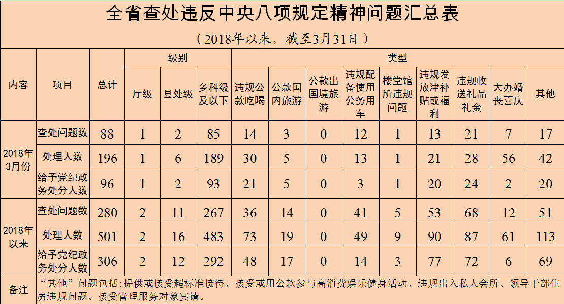 2018年3月,浙江全省各级纪检监察机关共查处违反中央八项规定精神问题88起,处理196人,给予党纪政务处分96人,其中,违规收送礼品礼金问题21起,违规公款吃喝问题14起,违规发放津补贴或福利问题13起,违规配备使用公务用车12起,这4类问题占查处问题总数的68.2%。从受党纪政务处分人数看,厅级1人,县处级2人,乡科级及以下93人,其中乡科级及以下占96.9%。