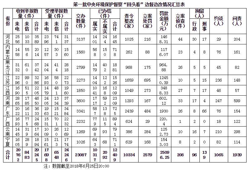 截至6月25日晚20:00,6个督察组共收到群众举报29245件,受理有效举报24246件,经梳理合并重复举报,累计向被督察地方转办交办23087件;各被督察地方完成查处12409件,其中立案处罚2579家,罚款25096万元;立案侦查208件,拘留235人;约谈1065人,问责1939人。但从各被督察地方报送情况看,广东群众举报办结率偏低;黑龙江、河南群众举报不实问题占比较高;广西、宁夏尚无因环境违法犯罪而拘留的人员。这些需要引起当地党委、政府高度重视。