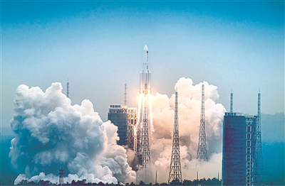 长征五号火箭先后于2016年和2017年两次发射,其中第二次因火箭发动机故障未能将卫星送入预定轨道。面对挫折,科研人员发扬革命乐观主义精神,树立必胜信心,历经两年多艰苦攻关、圆满完成了第二发失利故障归零和后续火箭的发射任务。图为2021年4月29日,搭载着中国空间站天和核心舱的长征五号B遥二运载火箭,在我国文昌航天发射场点火升空。