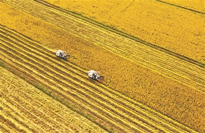 江苏省句容市天王镇戴庄村的农民抢收稻子,确保颗粒归仓。 新华社发(钟学满 摄)