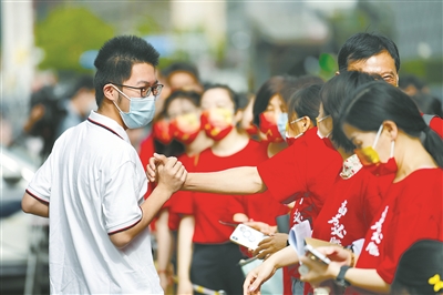 6月7日,2022年全国高考拉开帷幕。图为在北京市陈经纶中学考点外,送考老师为即将进入考点的考生(左)加油鼓劲。 新华社记者 鞠焕宗 摄